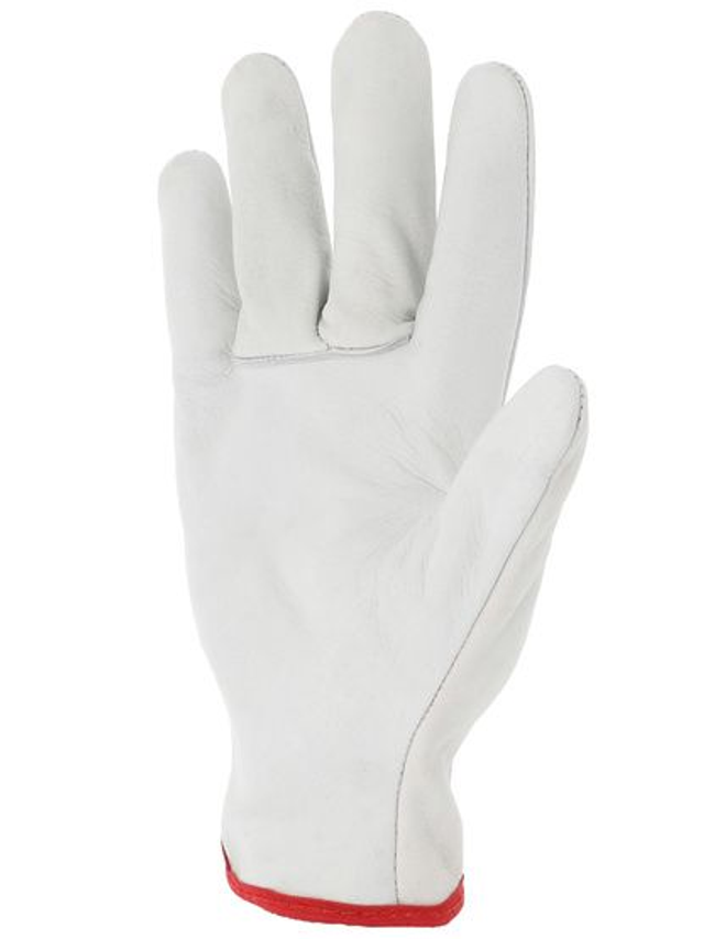Montage type "américain". Cuir tout fleur de bovin. Liseré au poignet. Serrage élastique au dos. Pouce palmé. Passepoils de renfort aux coutures du pouce, du majeur et de l'annulaire. Modèle type gant de maîtrise. Coloris naturel.
